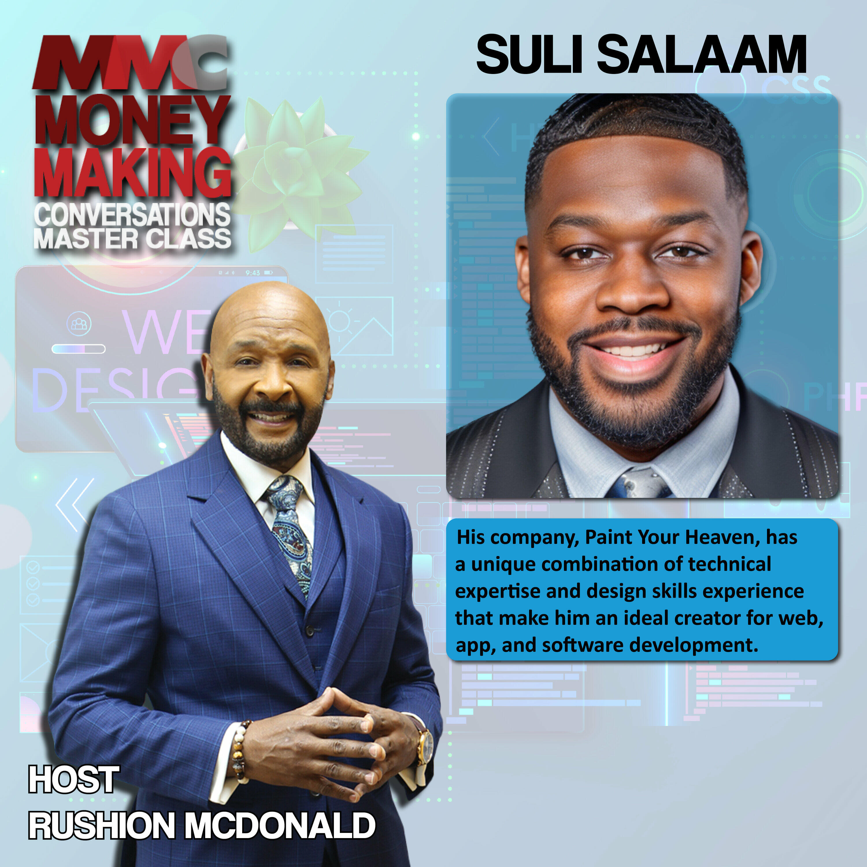 Two-time Emmy and three-time NAACP Image Award-winning television Executive Producer Rushion McDonald interviewed Suli Salaam. His Paint Your Heaven company’s unique combination of technical expertise and design skills experience makes him an ideal creator for web, app, and software design and development.